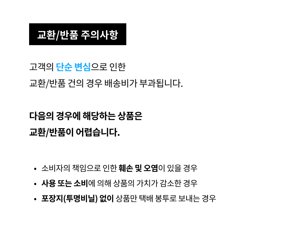 3. 판매자 과실로 인한 사유는 무료 교환 및 반품이 가능합니다.