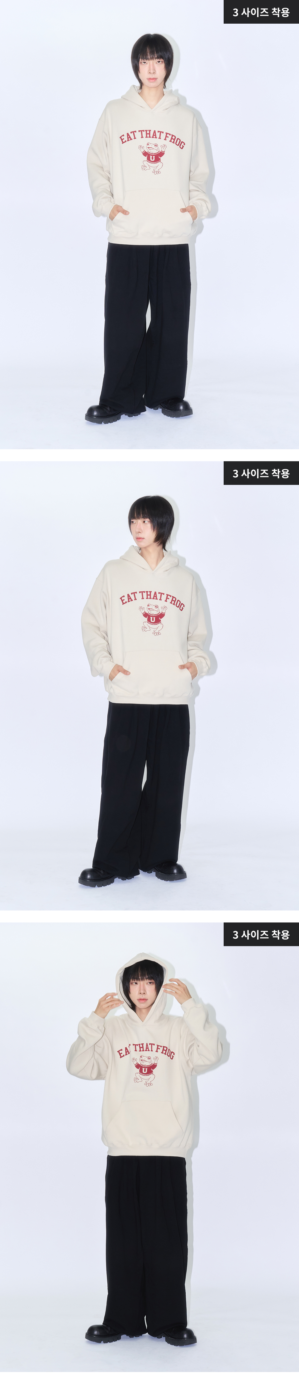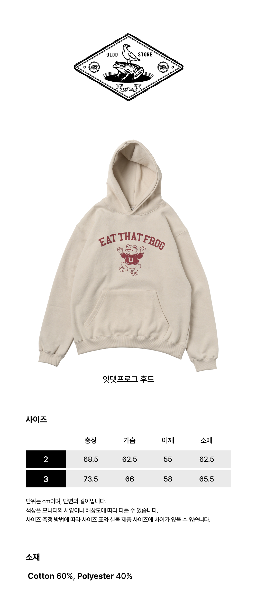 유쾌한 개구리 그래픽과 'EAT THAT FROG' 프린팅이 돋보이는 후드입니다.